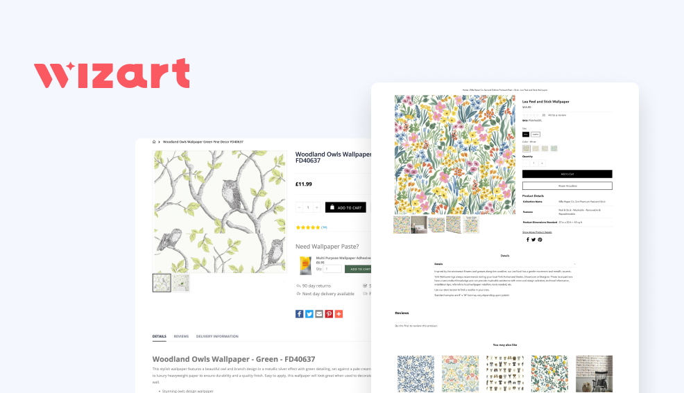 Apart from the basic elements like title, image, price, and the Add to cart button, they also use additional tools. For example, you can add the glue suitable for the selected wallpaper to the cart, calculate the required amount of material or order a sample right on the first screen.