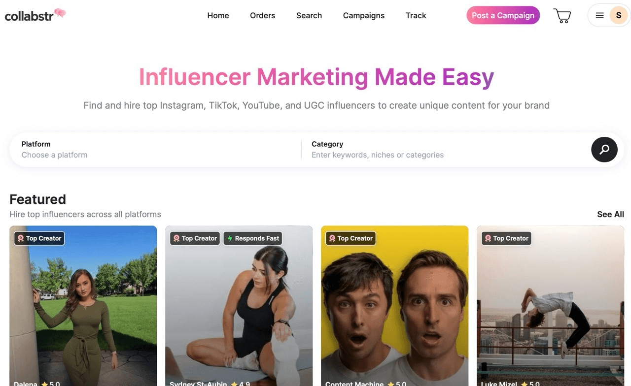 Collabstr allows brands to browse and book creators with upfront pricing and deliverables, minimizing negotiation. It’s ideal for small campaigns, launches, or first-time influencer marketing efforts.